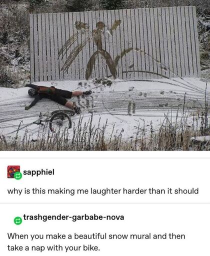 Mountain biking track. The guy rode up on the wall, splat into the snow, then slid down to their current position, leaving a human-shaped outline on the snowy wall