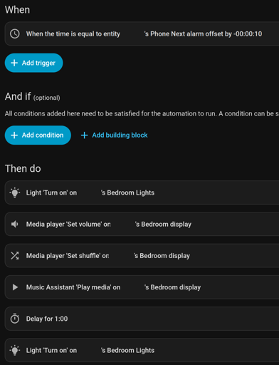 - Configure the Music Assistant addon to connect to your preferred device and music provider. (If it’s YouTube make sure to grab the cookie in a private browser window!) -Create a Home Assistant automation that is triggered when the time matches the Next Alarm sensor. (Maybe offset it back by a few seconds to prevent update delay causing it to miss.)