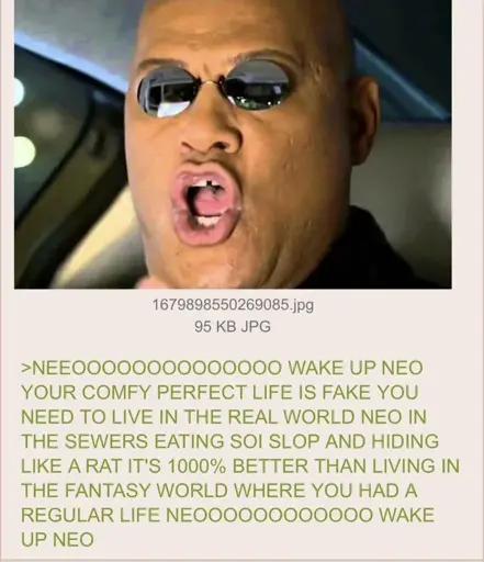 Also, y’know, Neo was miserable and depressed and trying to figure out why he felt like there was something deeply wrong with the world and then took a pill to explore the truth and gain the agency over his life he was lacking. Unrelatedly the authors are trans and left wing.