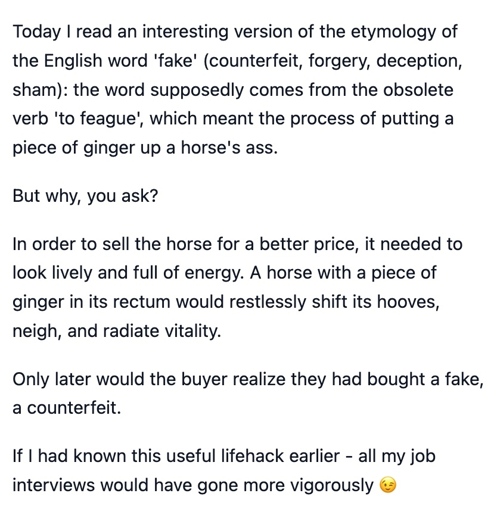 Feaguing does have a second meaning which is described in the post, but I couldn’t find mentions of that meaning linked to the word fake. But the practice of feaguing has apparently evolved from horses to humans as an act known as figging…I’ll leave to look that one up on your own (or not).