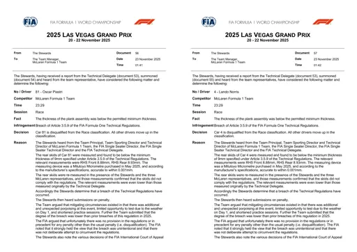 Post-race, the rearmost skid wear on both McLaren MCL39 machines was found to be below the minimum 9mm thickness by technical delegates on inspection.