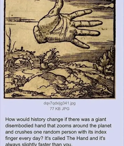 If it’s been with us all through history, I guess the further back you go, the more likely it is that you will have seen someone be crushed by the hand. And global travel? That’s the foundation for a persistent global mythology that’d probably dominate our storytelling for a while. I don’t know what all happens between then and the point where we have satellites that track the hand all the time, but I bet there’s potential for a novel. Or an anime. Or at least a comic.