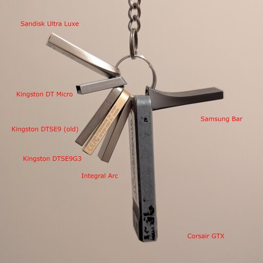 - Samsung Bar has the fastest random writes, and decent performance in other metrics for its USB stick form factor, but sits awful on a keychain due to the angled hole.