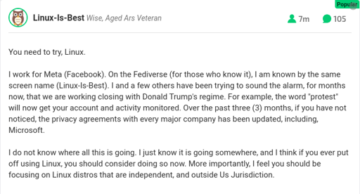 A couple years ago this Linux-Is-Best dipshit somehow got onboarded as a mod of the /r/massachusetts subreddit, started banning a ton of users for pretty unreasonable reasons, brought a few other seemingly random moderators on board and almost nuked it out of existence by being an unhinged little weirdo. They claimed to have worked at Facebook/Meta and I forget which, but they were found out either to have made it up or they were just a bottom tier content moderation employee.