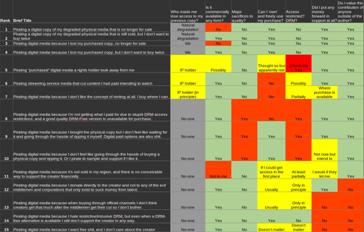 I tried to condense each rank and make it less about a specific type of media like CD audio or DVD video, along with a table of simplified characteristics of each situation. Of course more levels can be added and there are many situations not covered. This hierarchy is simply the way Louis ordered it from more to less justifiable; he respects people can think about it differently and I do too. He suggests that he doesn’t really care about people that pirate without giving a shit about creators, and that he only has a problem with people who aren’t honest with themselves about their motivations.