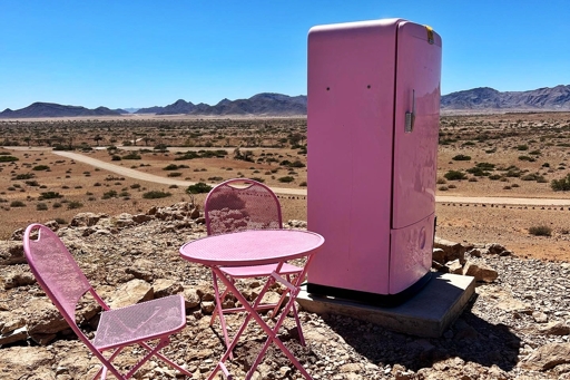 TLDR: Theres a solar powered pink refredgerator in the Nambian Desert.