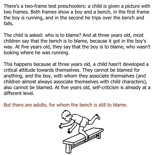 Adulthood doubles the frames: add one with no bench, and one with someone putting a bench in front of the child. The conclusion doesn’t change: it’s the kid’s fault for tripping over the bench. We just collectively ignore that the kid was fine until someone put a bench in the way.