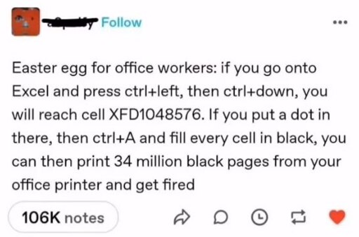I actually accidentally did this at school way back when. My mate and I decided to have an “Excel” race, where we’d start at the top of the sheet and see who could reach the bottom first by holding down either down arrow or pg down (this is obviously fun when you’re 15).