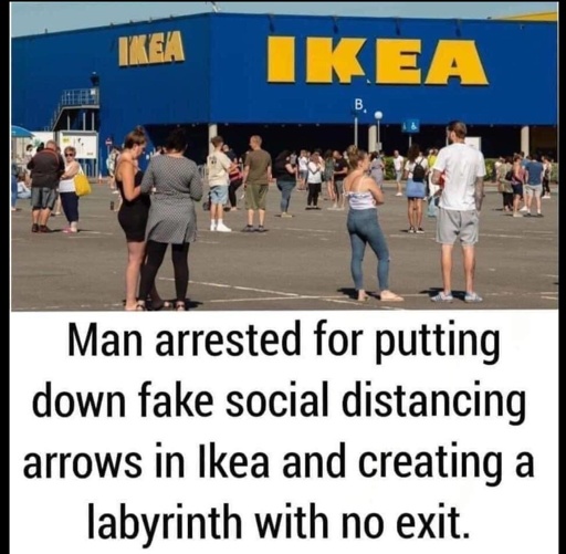We were shopping in an Ikea a year or so ago, in the furniture section. It’s just a bit past the entrance to “the maze”. A screeching fire alarm goes off. For about 10 minutes, everyone – including the Ikea employees – just ignore it and continue doing whatever. Then the Ikea employees start saying, “Please exit the store” or somesuch. That’s when I dawns on me that exiting the store is not as easy as it sounds. We could see no marked fire exits. The employees just said the “follow the arrows”.