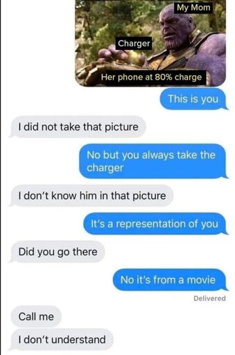 “Yes mom, I’m sorry to tell you I’m part of Thanos’ army now. He is traveling planet by planet to erase 50% of every global population. I think it’s really smart. You might disappear though, but it’s all for the balance. Once we kill those pesky Avengers and collect all the Infinity Stones we’ll be right on our way. Sorry, can’t talk now, hope your phone is charged over 80%, busy busy. And thoughts and prayers that you’re part of the 50% that remains! If so I’ll call you tomorrow after we kill Spider-Man. Love you.”