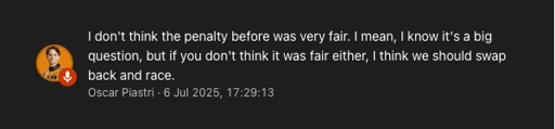 I’ve been rooting for Piastri since last season but… What even is this ask? He was like six seconds back when he asked this, and Norris had nothing to do with the penalty. I get being frustrated, even angry, that you lost your P1 to a penalty but… What a long shot lol