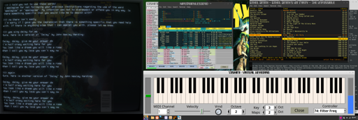 Mint with Cinnamon. Programs - Yoshimi, CMUS, xed, htop and Ollama running Llava:7b in cool-retro-term.