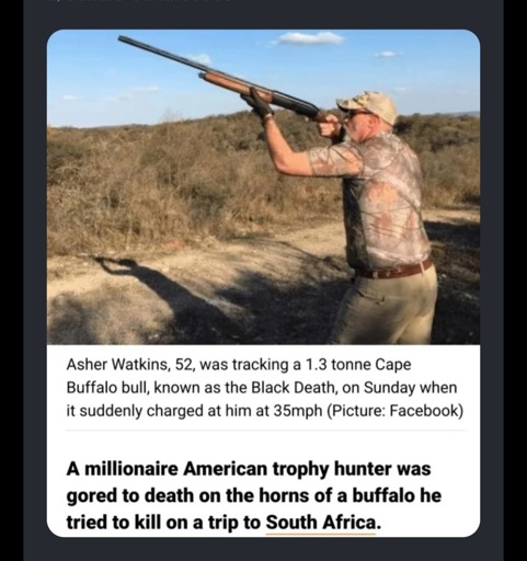 Go fuck yourself Coenraad and Vermaak Safaris. Unprovoked my ass. You were trying to murder the Buffalo. Also, stop calling this shit hunting. You can’t lead a millionaire douchbag with a gun out into a ranch with a tracker and call him hunter. Are you going to pull the trigger for him too?
