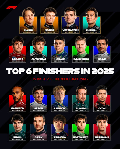 LCP@lemmy.world to Formula 1@lemmy.world · 6 days ago19 of the 21 drivers to start a Grand Prix in 2025 have scored a top-six finish so farlemmy.worldimagemessage-square3fedilinkarrow-up130arrow-down10file-text