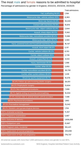 I do also think it would be more interesting to see something like the top 15 admission types for men and top 15 for women without the 80% threshold requirement to get a wider spread of women-skewed admissions.