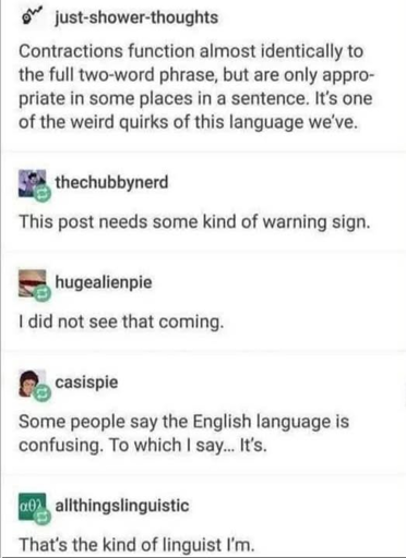 Unfortunately I’ve studied English at uni thinking it might’ve in some capacity become useful by now. Alas, so far I’ve’d no opportunity to use the nonsense I’ve learnt other than to shitpost about it. Woe’m’st’ve’d is me.
