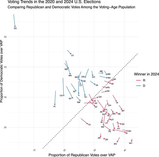 This would be super interesting to see over many election years, stacking arrows might be tough but maybe a simple animation?