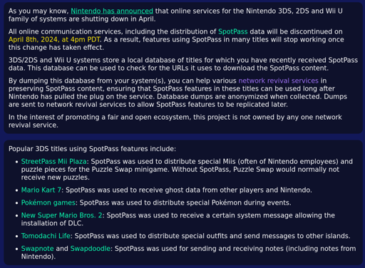 DreitonLullaby@lemm.ee to Technology@lemmy.worldEnglish · edit-21 year agoPlease help preserve your 3DS and Wii U SpotPass data before it's too late!plus-squarelemm.eeimagemessage-square0fedilinkarrow-up11arrow-down10