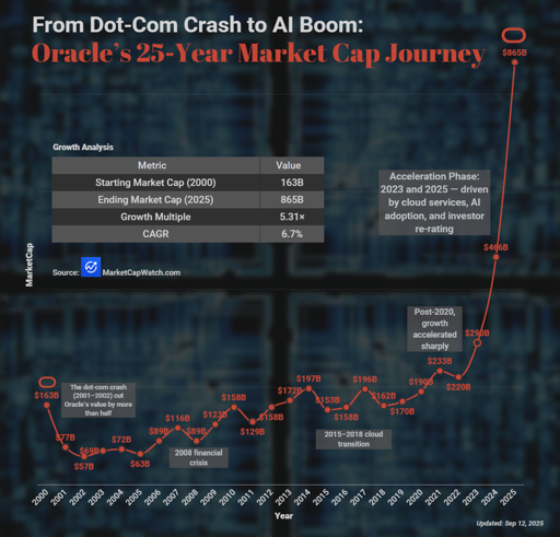Jimmymcool@lemmy.world to Data is Beautiful@lemmy.worldEnglish · 20 days agoOracle’s 25‑Year Market Cap Journey: From Dot‑Com Crash to AI Boomplus-squarelemmy.worldimagemessage-square0fedilinkarrow-up12arrow-down10