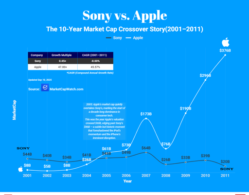 arrow-up11arrow-down1imageSony vs. Apple -- The 10-Year Market Cap Crossover Story(2001–2011)plus-squarelemmy.worldJimmymcool@lemmy.world to Data is Beautiful@lemmy.worldEnglish · 25 days agomessage-square0fedilink