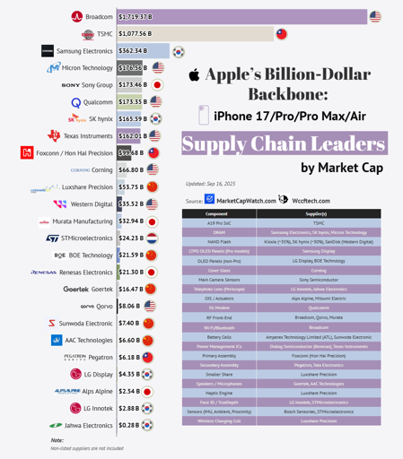 arrow-up11arrow-down1imageApple’s Billion‑Dollar Backbone — iPhone 17/Pro/Pro Max/Air Supply Chain by Market Capplus-squarelemmy.worldJimmymcool@lemmy.world to Data is Beautiful@lemmy.worldEnglish · 18 days agomessage-square0fedilink