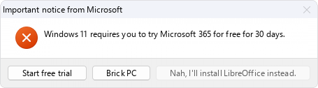 ScienceGuy722@lemmy.world to Funny@sh.itjust.works · edit-21 month agoWindows 11 summarized in a fake error message I made.plus-squarelemmy.worldimagemessage-square8fedilinkarrow-up12arrow-down10